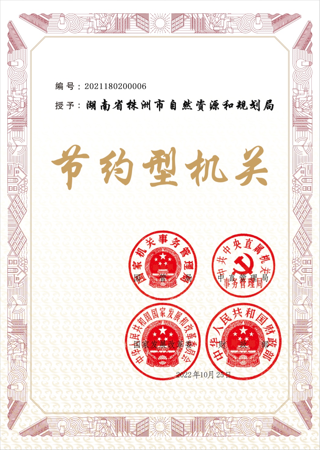 近日,株洲市自然资源和规划局被国家机关事务管理局、中共中央直属机关事务管理局、中华人民共和国国家发展和改革委员会、中华人民共和国财政部联合授予"节约型机关"称号。