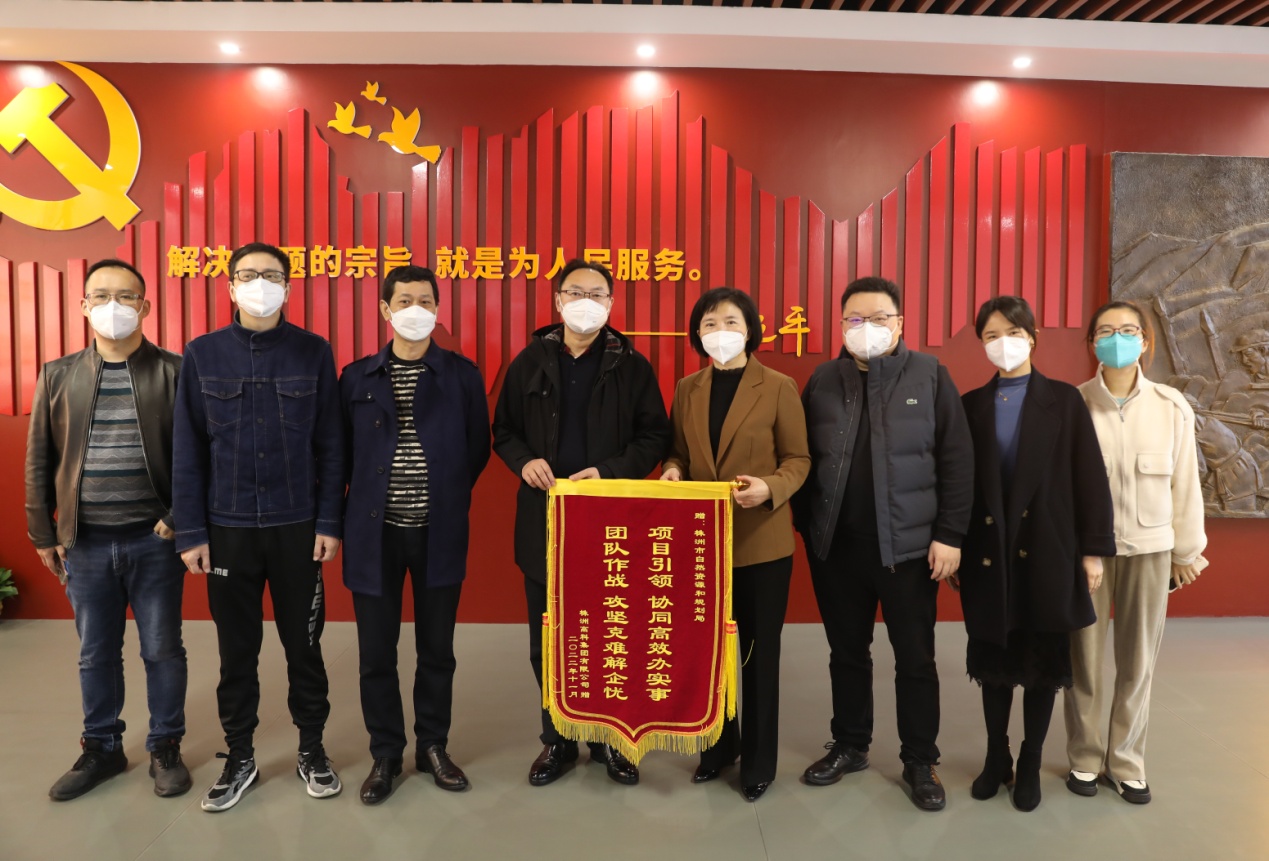 "项目引领 协同高效办实事 团队作战 攻坚克难解企忧"。11月29日,株洲高科集团有限公司党委副书记罗文斌送来一面锦旗,为感谢株洲市自然资源和规划局"三资"盘活存量资产权证办理工作的优质高效服务。