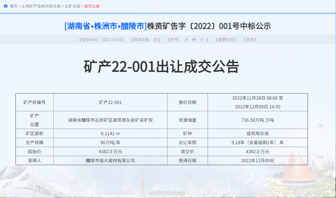 总成交价近亿元!株洲两宗灰岩矿采矿权成功出让