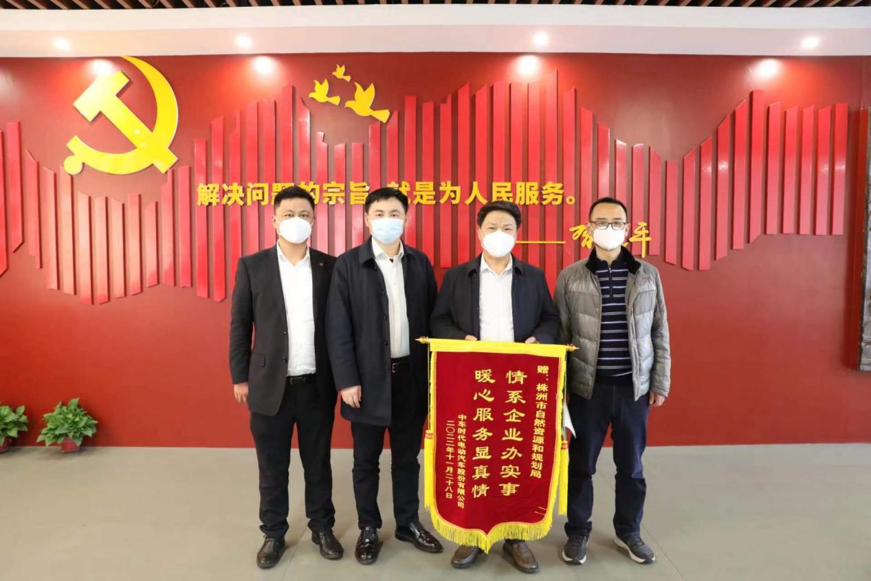 1月11日下午,中车时代电动汽车股份有限公司企业发展部部长旷明秋专程来到株洲市自然资源和规划局,送上一面"情系企业办实事 暖心服务显真情"锦旗,以感谢市自然资源和规划局登记工作人员为该企业电动汽车及关键零部件产业化基地(汽车餐厅工程)项目所付出的贴心服务和专业指导。