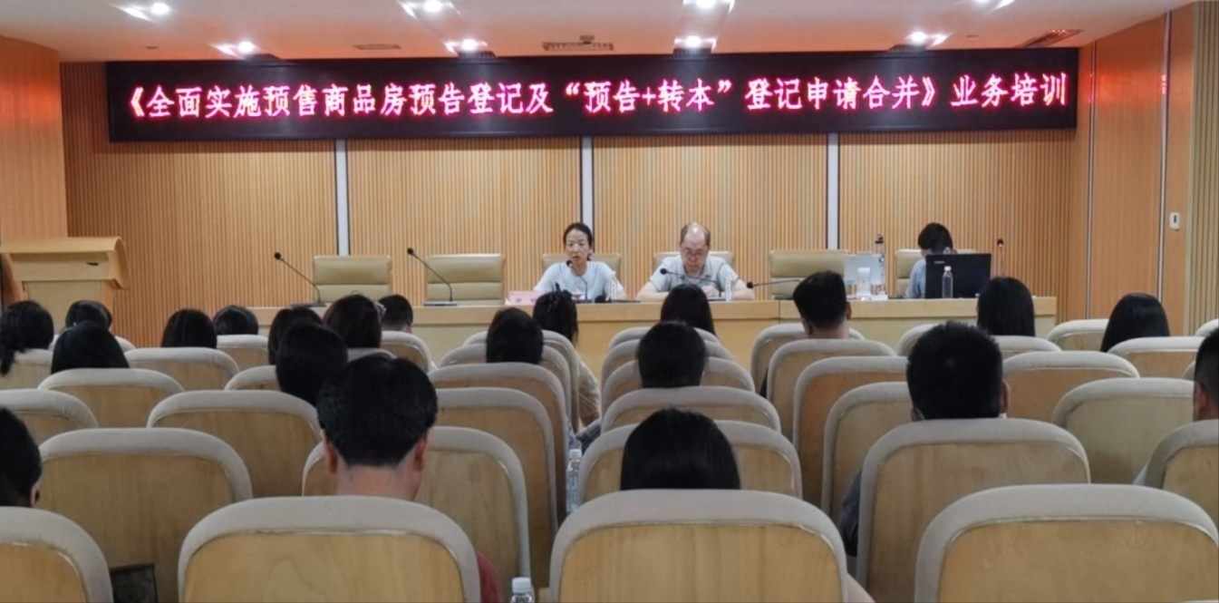 为深化"交房即交证"改革,进一步优化营商环境,最大限度方便企业、群众,推动我市不动产登记工作全面提质增效。5月30日下午,市自然资源和规划局组织全市房地产开发公司、金融机构相关工作人员举办"全面实施预售商品房预告登记及"预告+转本"登记申请合并"的专题业务培训会。