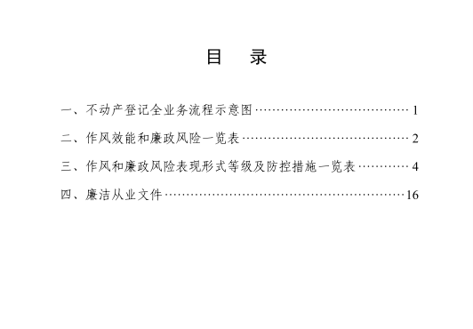 手册针对株洲市不动产登记全业务、全流程进行逐一排查,并全面梳理了不动产登记业务工作中可能产生的作风效能和廉政风险问题;手册细化了流程环节中风险点所具体表现的形式,还通过"高、中、低"划分风险预警,同时一一明确相应的防控措施以及落实责任主体。共分为四部分,第一部分为不动产登记全业务流程示意图;第二部分为作风效能和廉政风险一览表,共梳理出作风效能和廉政风险点19个;第三部分为作风和廉政风险表现形式等级及防控措施一览表。共梳理作风效能和廉政风险表现形式及风险等级30个、制定防控措施37个;第四部分为廉洁从业文件。选编了《中国共产党廉洁自律准则》《党员廉洁自律规范》等文件。
