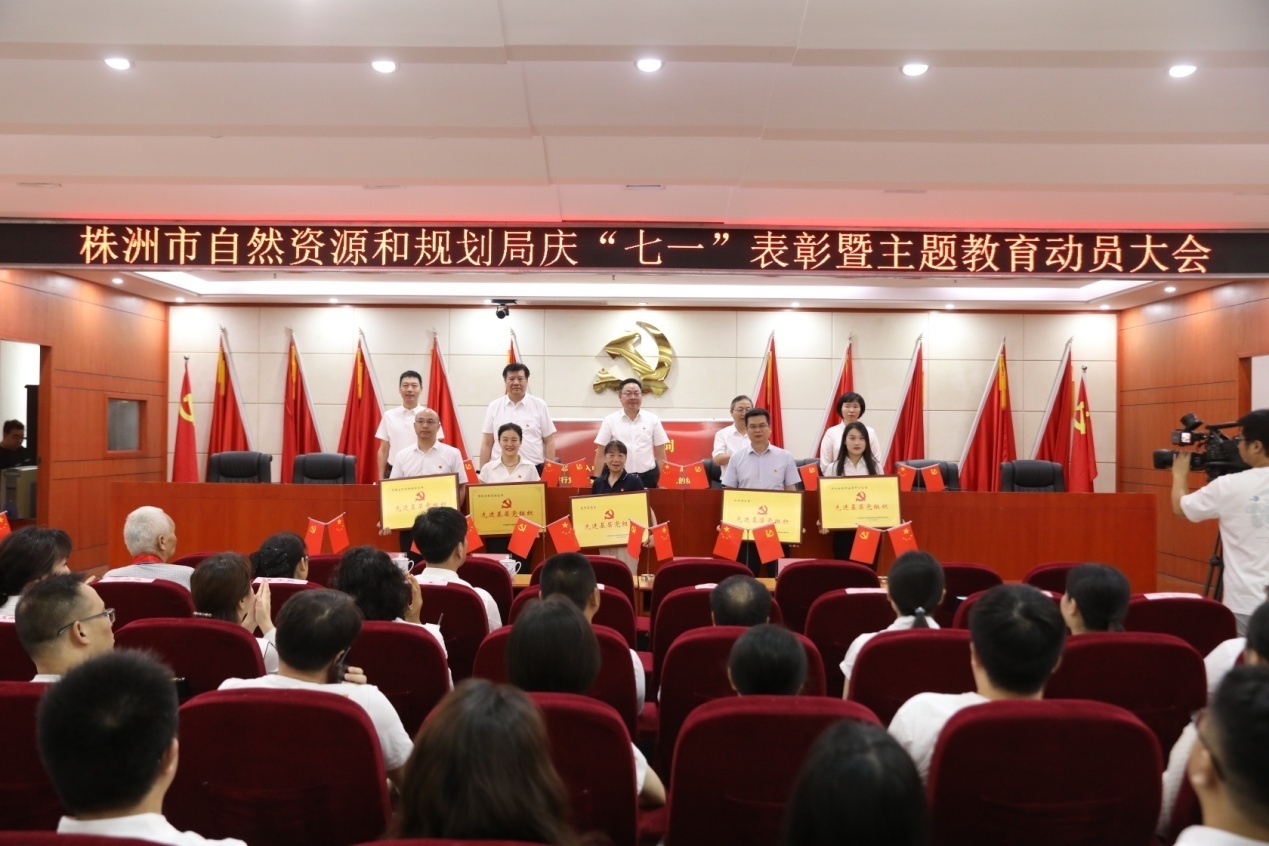 局党组成员、总经济师巫智敏宣读《中共株洲市自然资源和规划局直属机关委员会关于表彰优秀共产党员、优秀党务工作者和先进基层党组织的决定》,局领导为5个先进基层党组织颁发奖牌。