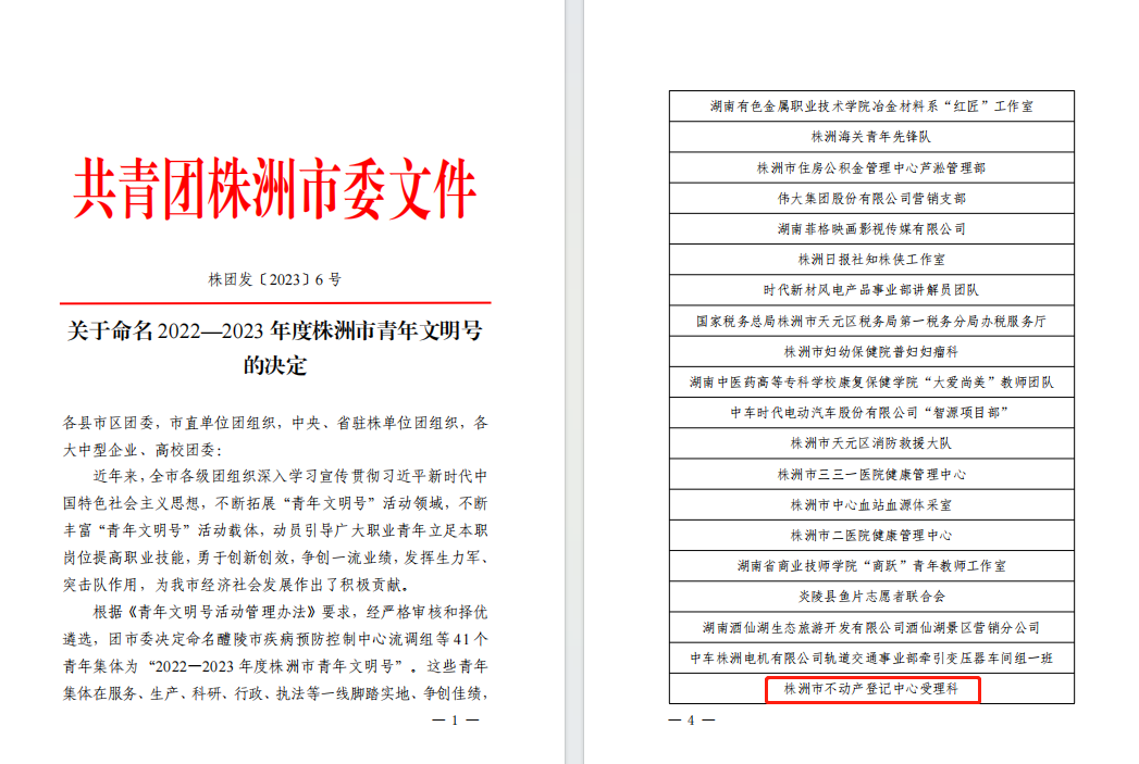 近日,共青团株洲市委印发《关于命名2022-2023年度株洲市青年文明号的决定》,经过层层筛选,株洲市不动产登记中心受理科荣获"2022-2023年度株洲市青年文明号"荣誉称号,这也是继2017年度后再次获此殊荣。