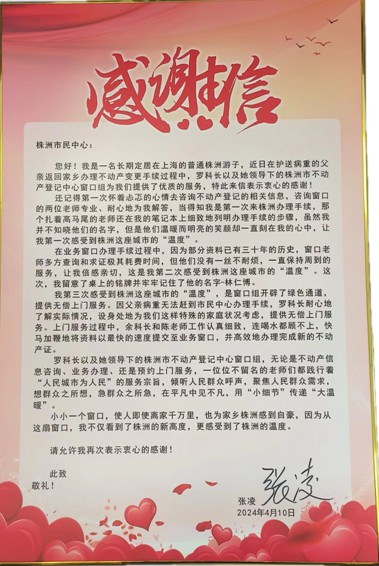 这封感谢信不仅是对个人工作的肯定,更是对株洲市不动产登记人团队精神的赞美。他们的使命与担当,体现在每本不动产权证背后,为市民创造了便捷和满意。让我们共同为这些“最美不动产登记人”点赞,他们的服务温暖了株洲市民的心,也刷亮株洲这座城市的颜值!