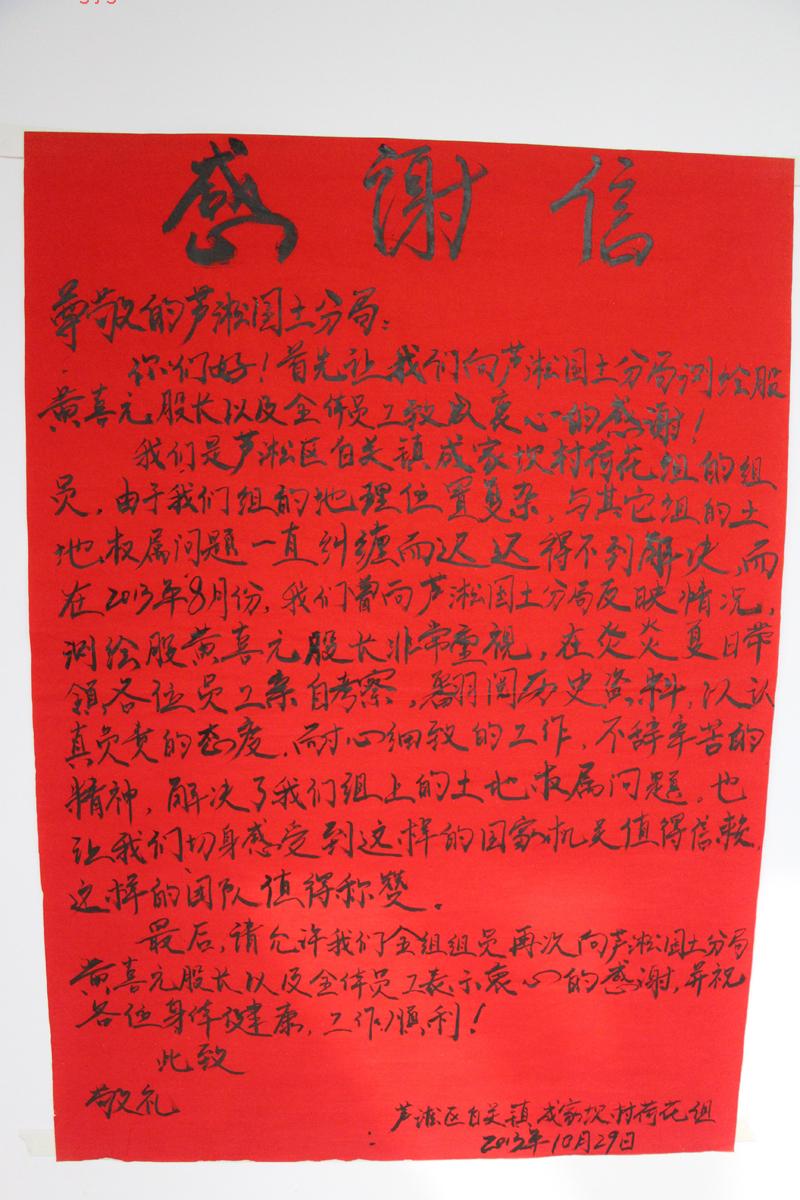 集体土地确权工作开展以来,分局高度重视,积极布署开展各项工作。专门负责此项工作的矿产测绘股黄喜元股长,是位长期在基层工作的女同志。她克服困难,勇挑重担,任劳任怨,扎实工作。在工作期间,常时间顶着炎炎烈日,奔波于各个乡、村、组进行现场调查、调解,宣传政策;又往返于市局、县林业局、区林业局、市信息中心各个部门之间,查找资料、档案,确保权属纠纷合理解决。此次送锦旗的白关镇陈家坝村,就是因权属牵涉到组与组、村与村的多重纠纷,多年来牵扯不清,矛盾尖锐,村组之间因权属纠纷素有不和。黄喜元股长带领工作组顶着压力,不惧不怯,深入调查了解情况,凭借多年的基层工作经验和高度责任心,跟村民讲政策、摆道理,反复做工作,终为确定处理解决方式,划定权属界线,为该村组的历史纠纷划上了圆满句号。