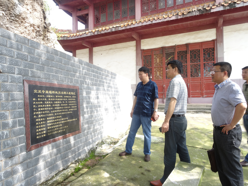 程燕一行首先来到天元区雷打石镇空灵寺视察地质灾害治理工作,现场听取了曹明勋对空灵寺崩塌群成因、地灾工程治理的情况介绍,视察了安全防护网、注硂防护墙等治理工程。曾天青对分局承担的这项治理工作充分肯定,表示这是一项功在当代,利在千秋的民生工程。