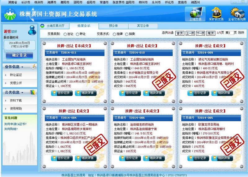 按照《中华人民共和国土地管理法》、《招标拍卖挂牌出让国有土地使用权规定》等有关法律法规和《招标拍卖挂牌出让国有土地使用权规范》,遵循公开、公正、公平原则,株洲县局于2014年10月27日,通过湖南省国土资源交易系统成功网上挂牌出让地块3宗,面积3.2155公顷,成交价款2390万元。