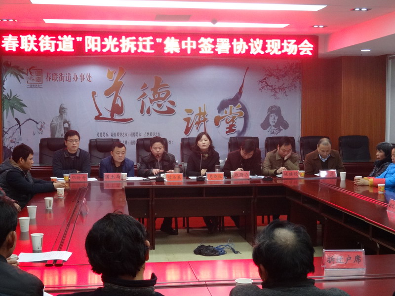 2015年12月25日,在东城新区重点工程项目部召开了一次“阳光拆迁”协议现场签约大会。这次签约涉及项目范围内的6个村民小组、33户、33栋房屋、共计拆迁面积15400平方米,在签约现场所有拆迁户都签订拆迁协议。这次集中签约大会是继今年5月15日集中阳光征拆签约之后又一次在春联街道成功举行阳光征拆活动,也是全县在拆迁工作中第一次一次性签订拆迁面积达15000平方米。