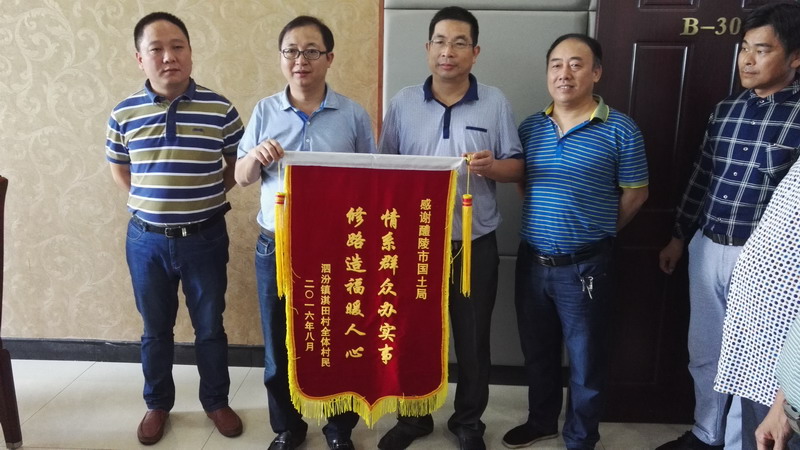 情系群众办实事,修路造福暖人心。8月22日上午,泗汾镇淇田村村民代表给醴陵市国土资源局送来了一面大红锦旗,感谢市国土部门勤政务实,为村民修路一事。局党组书记、局长陈佳代表全体干部职工接受锦旗,并召开座谈会。
