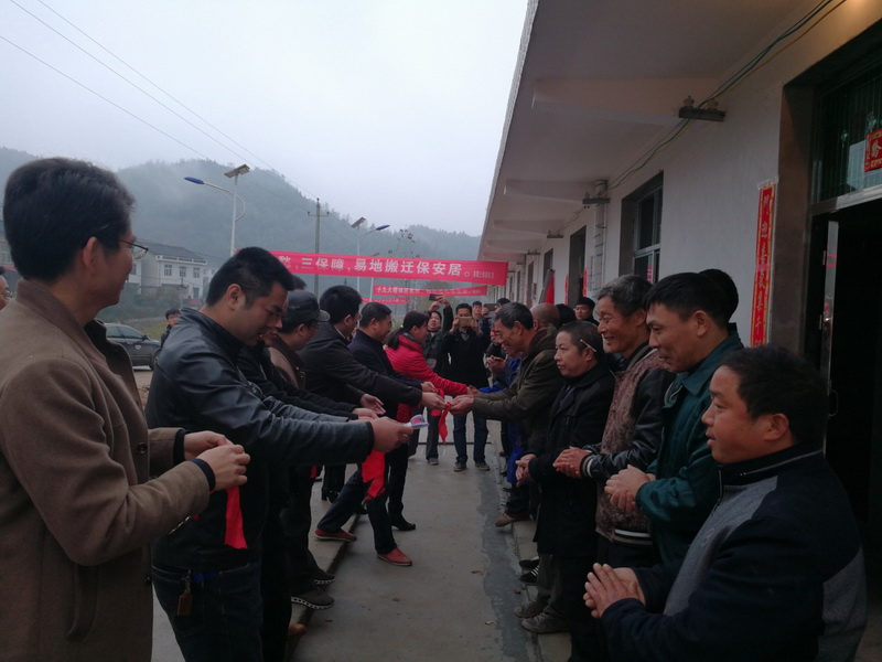 1月20日,省级贫困村——湖南省株洲县花冲村廖运金等9户贫困户共26人,领过钥匙,顺利搬进了该村易地扶贫搬迁安置点新居。该县国土部门为易地扶贫搬迁群众送上新炉灶、新被子等,贴好楹联、挂上挂历,还亲手烹制了一桌丰盛的饭菜,与贫困户们共进午餐。