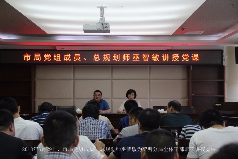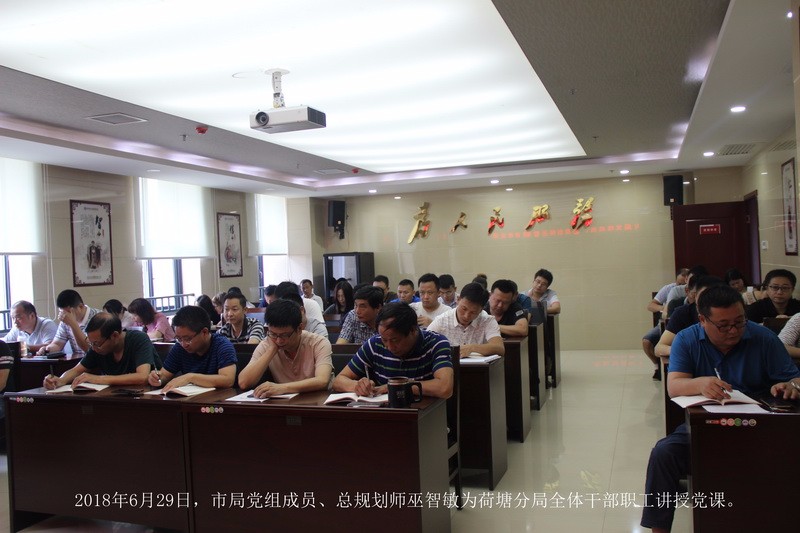 6月29日下午,市国土资源局党组成员、总规划师巫智敏同志围绕学习宣传贯彻党的十九大精神,以“把握重点持续推进,大力加强生态文明建设”为题为荷塘国土分局干部职工讲授了一堂专题党课。