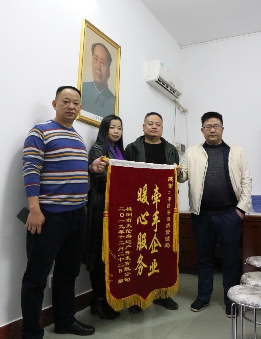 近日,株洲市天伦房地产开发有限公司总经理沈辉代表该公司及业主向茶陵县局赠送了“牵手企业、暖心服务”的锦旗,对茶陵县局主动想办法、出实招为企业解决不动产登记发证问题的做法表示高度肯定和衷心感谢。沈辉总经理说,茶陵县局领导和工作人员多次深入调研,了解企业需求,制定有效措施,为企业和业主办了实事、办了好事。茶陵县局党组成员、副局长谭全元,县不动产登记中心主任钟振成,茶陵县局不动产登记股股长谭军临代表茶陵县局对天伦房地产公司的认可、支持表示感谢。谭全元副局长表示,全县不动产登记改革启动以来,我们不断优化服务、简化流程、提高效率,努力为企业和群众解决实际困难和问题;“温暖企业”行动是我们进一步提升服务质量和水平的重要举措之一,我们将继续努力完善制度机制,为全县人民提供更优质、高效、快捷的服务。