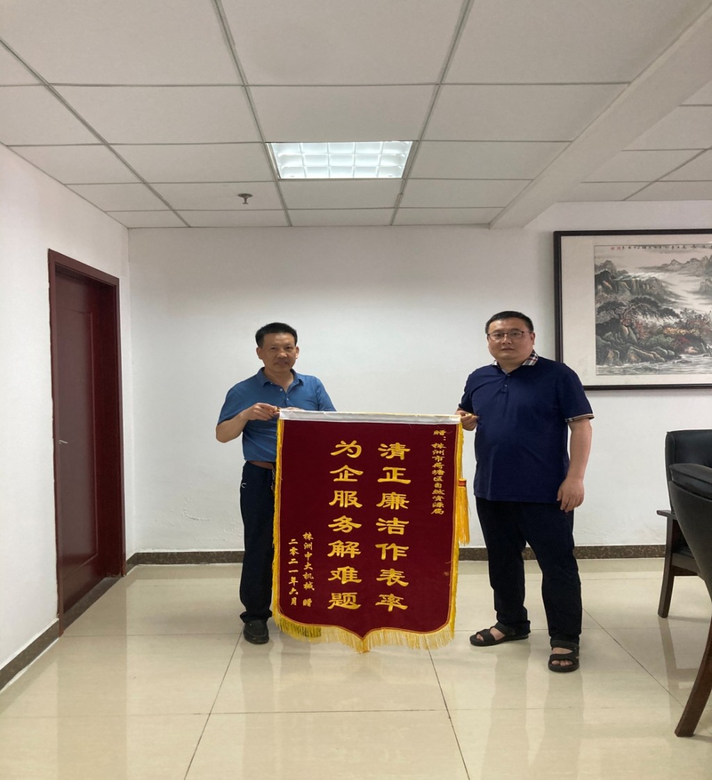 6月17日,株洲中大机械有限责任公司负责人向荷塘区自然资源局赠送了“清正廉洁作表率,为企服务解难题”的锦旗,对荷塘区自然资源局全心全意为企业服务、高效率为项目审批的做法表示高度肯定和衷心感谢。