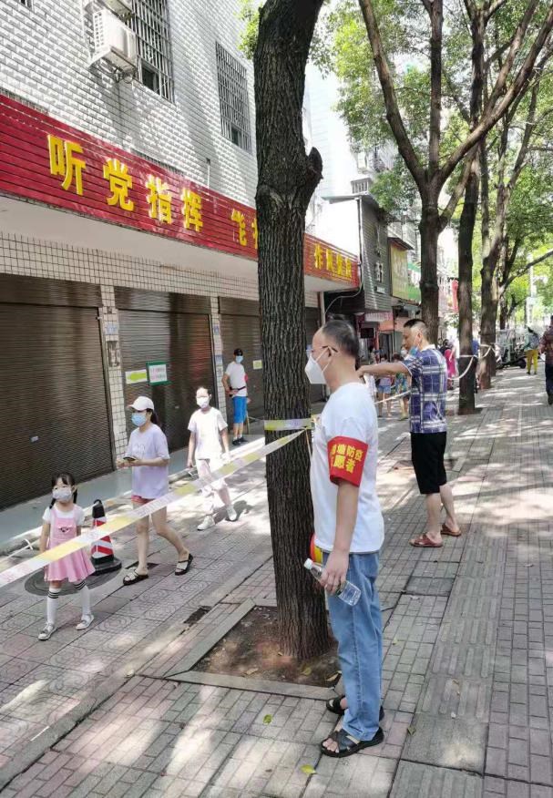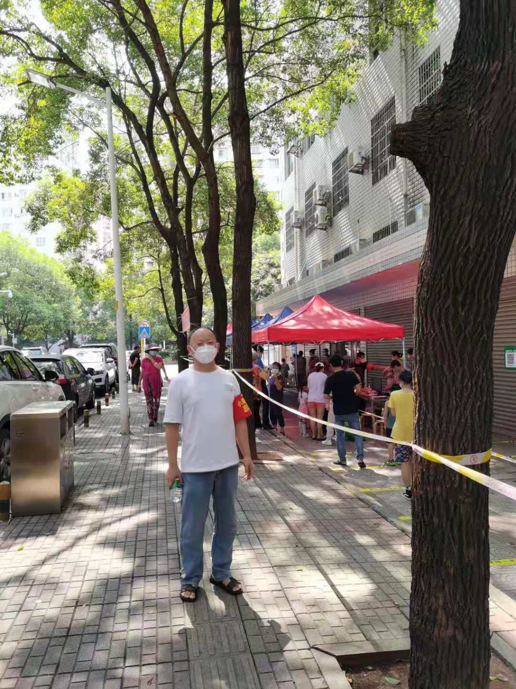 此前他已参加第一轮下沉太高社区疫情防控志愿工作,面对全民核酸检测任务繁重、人员紧张的情况,他毫不犹豫再次当起了志愿者,参与到核酸检测秩序维护的战斗中。每天从清晨奋战到深夜,邱前进和同事们冒着酷暑,戴着志愿者红袖标,在烈日下一站就是4个小时,每日不停地布置现场、搬运物资、查看健康码、引导居民有序排队,一遍一遍不厌其烦地劝导居民间隔一米,全力以赴做好疫情防控工作。