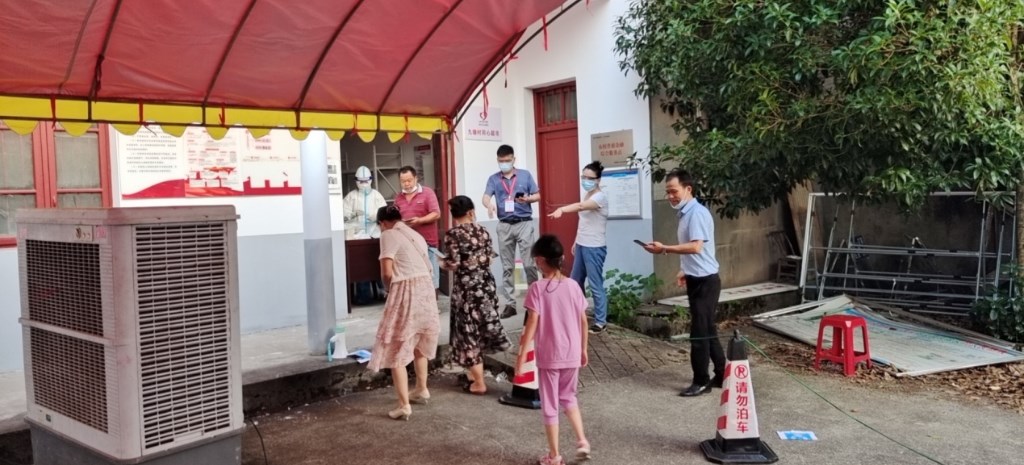 8月10日 ,九塘村开始第三轮核酸检测。检测前,工作人员分工协作,粘贴安全距离黄色标志、准备桌椅、用大喇叭在村里进行动员,为核酸采样顺利开展做充分准备。一切准备就绪后,在工作人员的引导下,居民排队有序进场。