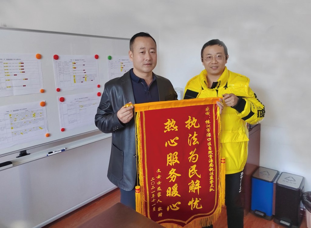 11月30日,渌口区自然资源局执法人员依法拆除开发商乱搭乱建钢架棚,解决小区业主难题,切实维护群众权益,受益群众送来感谢和写着“执法为民解忧, 热心服务暖心”的锦旗。