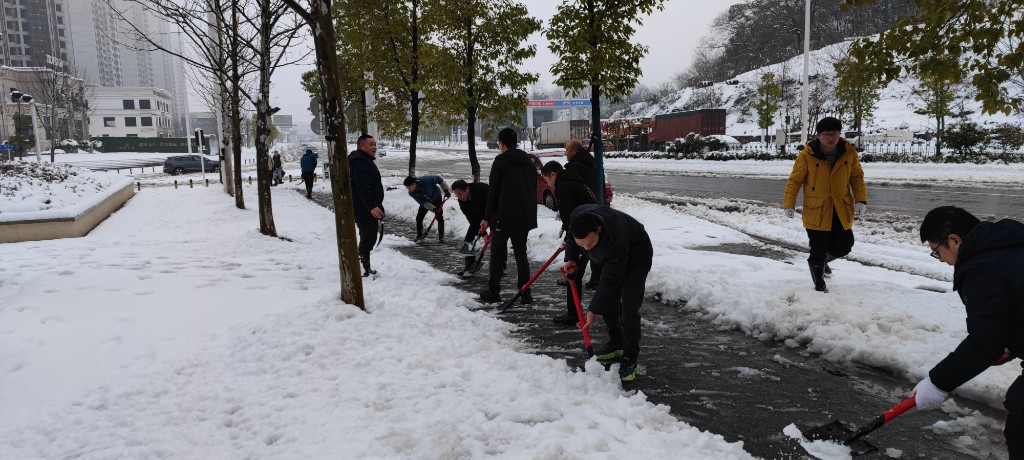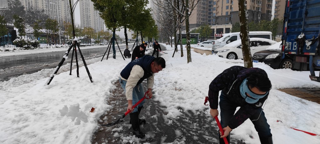 要在清晨人民群众出行前完成近2公里人行道的扫雪清理,时间紧、任务重,必须尽早投入“战斗”。为了及早赶到任务地点同时也为了保证自身出行安全,大部分除雪工作队员在凌晨5点半就走出了家门,谨慎的驾车赶往东部美的城,于6时许完成了集结。家住明照村的黄强同志,因担心雪厚行车不便,凌晨4点就动身出发;在乡镇国土所工作的邓华、沈兴广同志,22日晚因大雪被困办公室不能回家,23日凌晨,他们早早出发,踩着厚厚的积雪准时赶到集合地点。