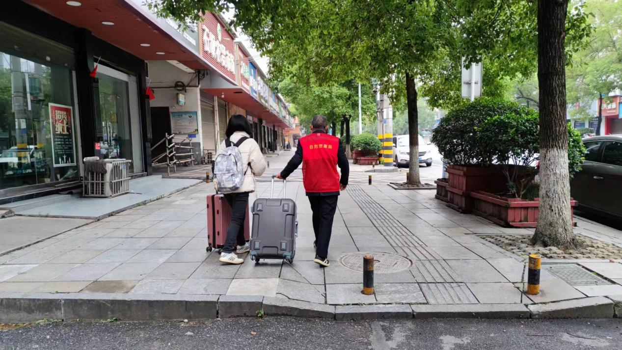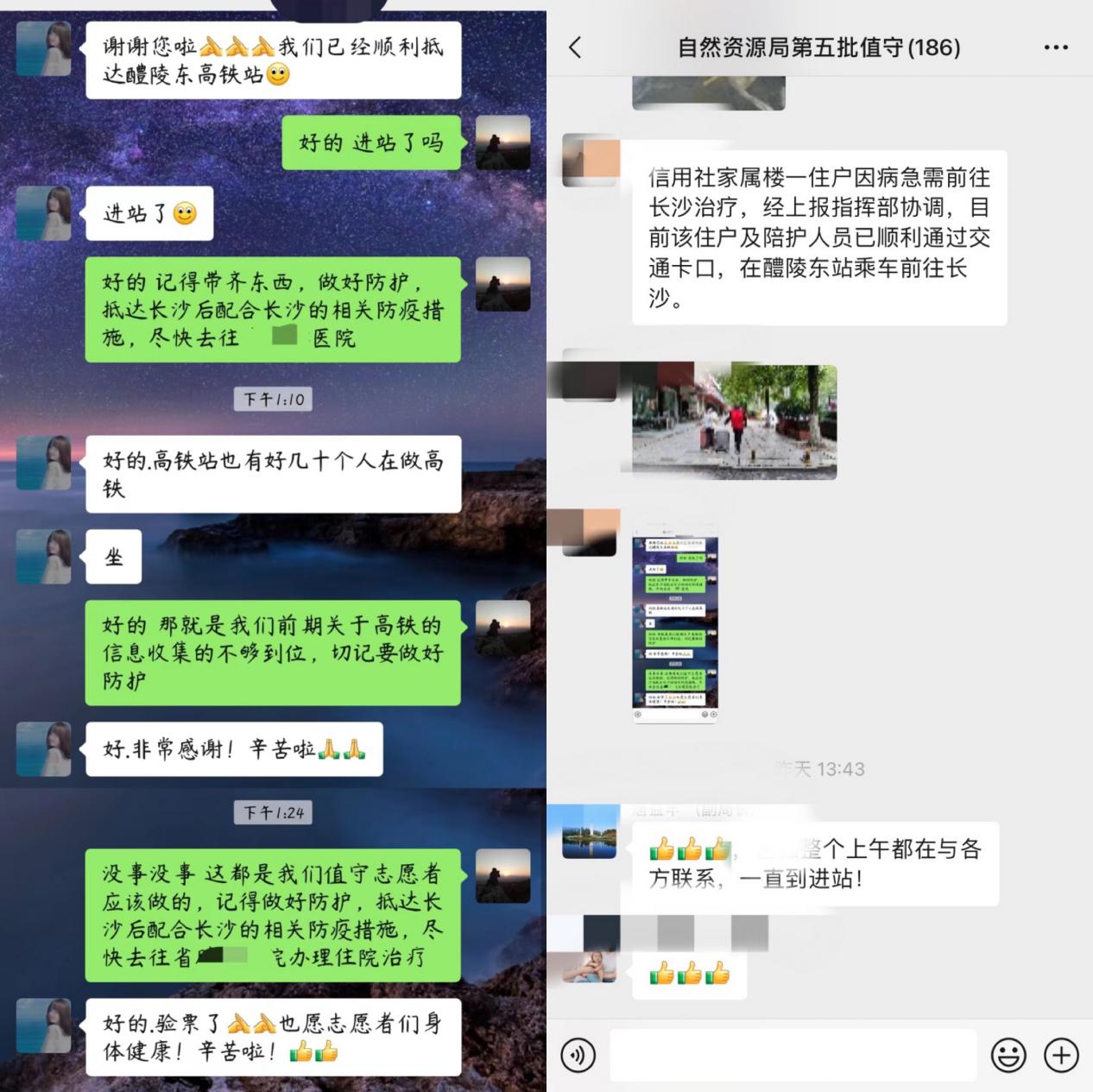 11月29日,值守在阳三石街道信用社家属楼的自然资源志愿者收到一住户的求助:"家中亲属因病急需前往长沙治疗"。在了解具体情况后,值守干部迅速上报指挥部进行协调,并帮助他们顺利通过各处交通卡口,前往醴陵东站乘坐高铁前往长沙。