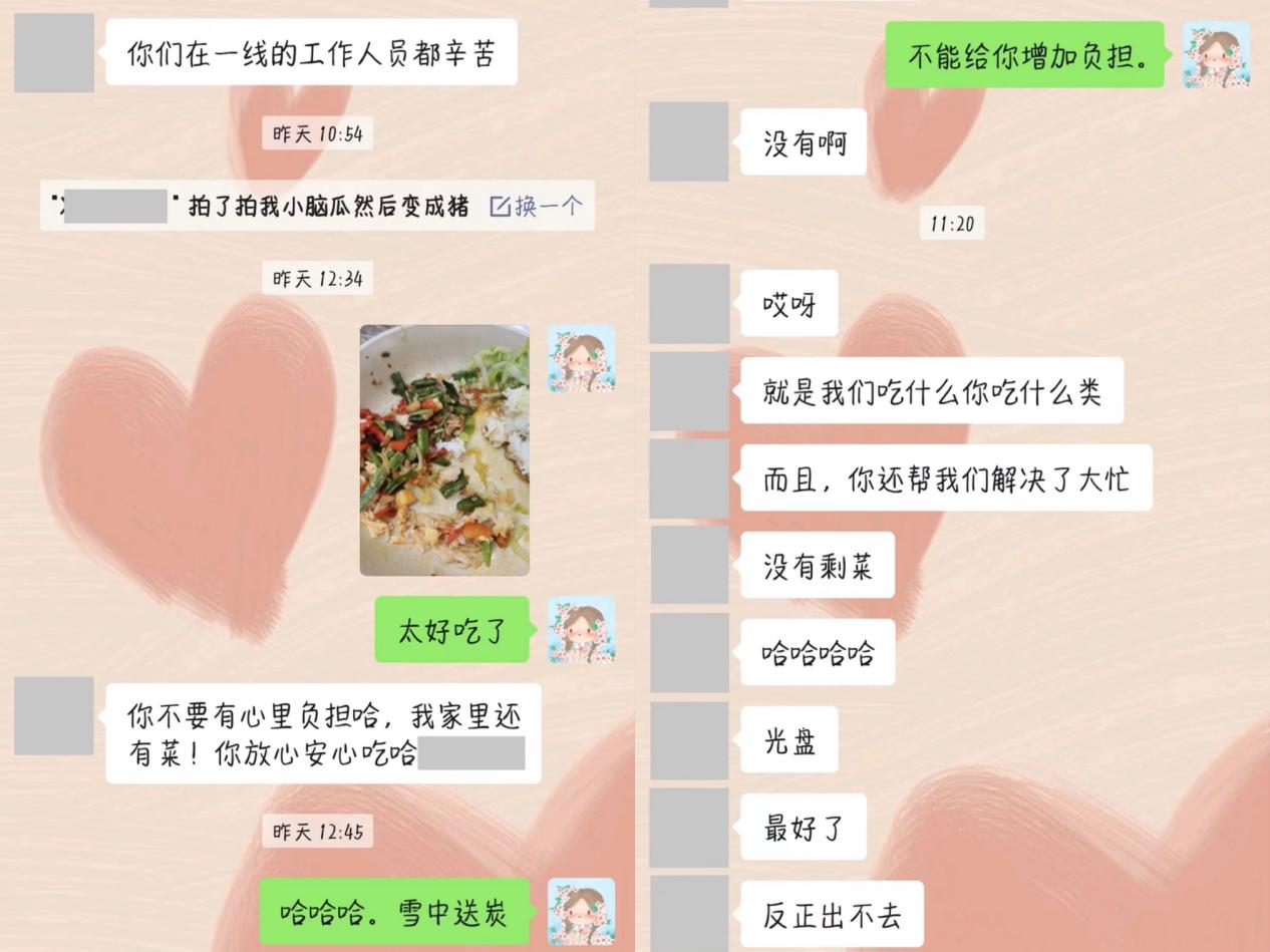 一碗热腾腾的面条,一份用心做好的家常菜,一碟香辣爽口的麻辣小吃,还有气温骤降时送来的取火炭盆......这些居民主动送上的每一份关怀,都能让值守干部心中温暖许久。