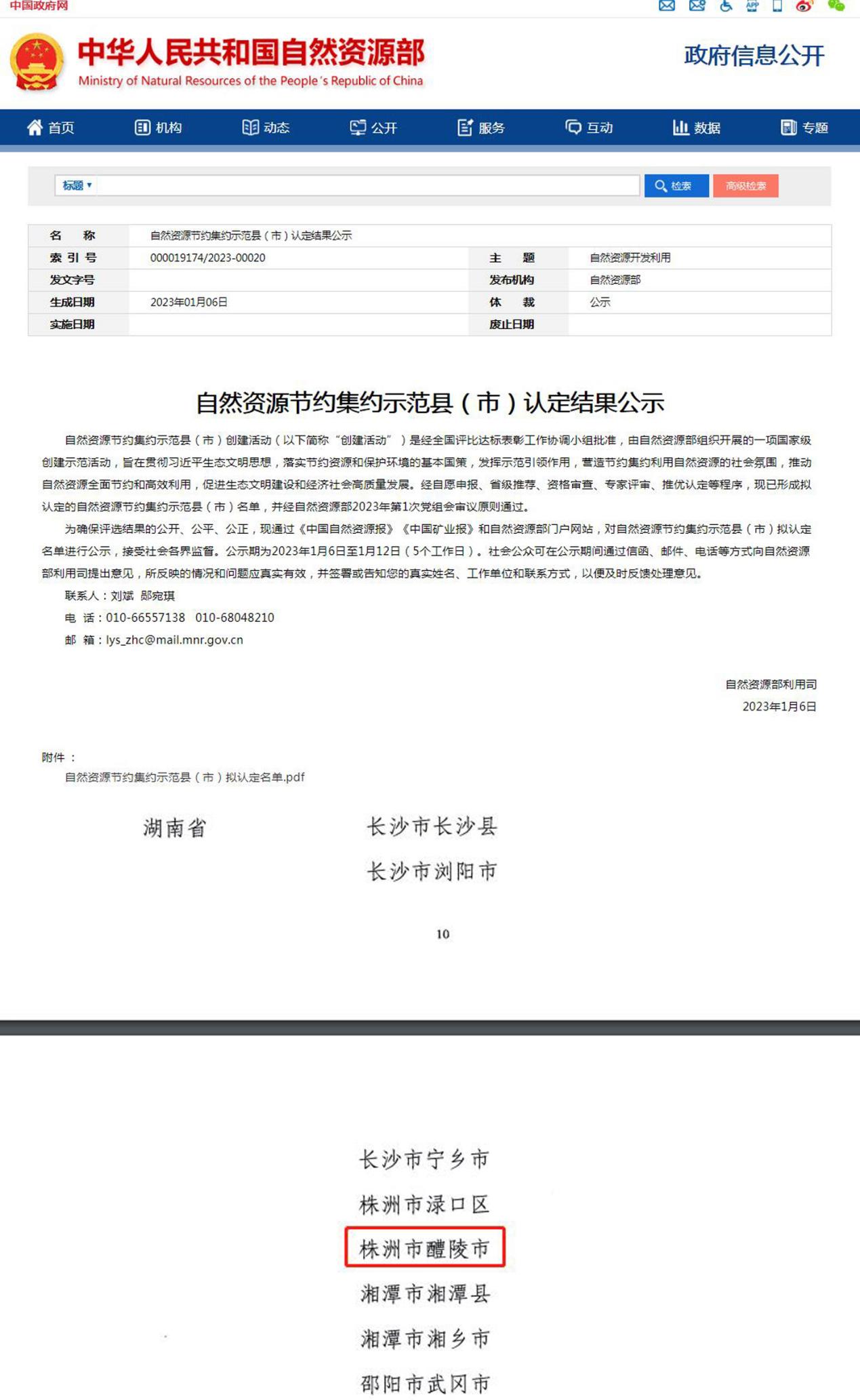 1月6日,自然资源部官方网站发布公示,经自然资源部2023年第1次党组会审议原则通过,正式公布全国首批"自然资源节约集约示范县(市)"名单,醴陵市成功入选。