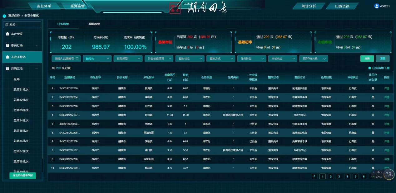 202宗任务已全部在湖南田长平台完成整改销号,非法占用耕地和非法改变耕地用途的违法行为得到了有效整治。此次整改行动的完成为醴陵市耕地保护树立了典范,有效提升了农业生产的质量和效益,推动了农村经济持续健康发展。