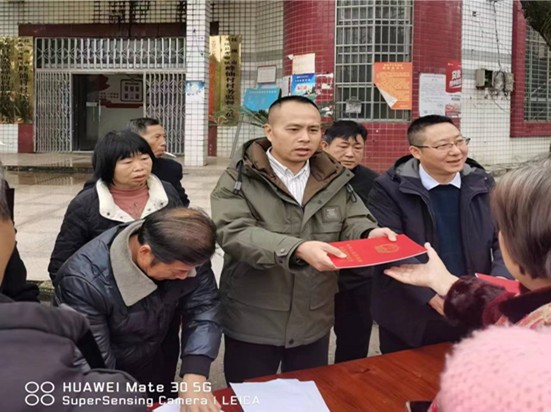 近日,茶陵县虎踞镇自然资源所工作人员在整理不动产权证书时,发现有部分群众办理的不动产权证书滞留在窗口迟迟未来领取,通过电话沟通发现部分群众未及时领取不动产权证,主要原因是大部分村民在辖区工地务工,抽不出时间前来领取。了解此情况后,该所立马决定,联合镇分管领导及工作人员,主动上门为村民发放不动产权证书,做好老百姓的贴心人,活动现场村民纷纷拍手称好。
