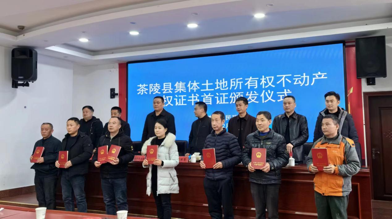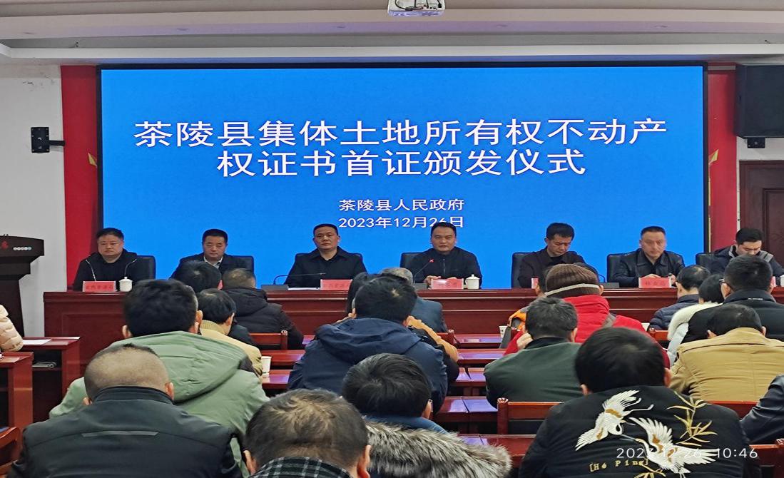 2023年12月26日上午,茶陵县农村集体土地所有权不动产权证书首证颁发仪式在下东街道虎塘社区举行,为桃坑乡桃坑村8个组颁证18本。在株洲市南五县中,茶陵县是首次确权登记到组。为进一步明晰产权维护农民合法权益,促进农村社会和谐稳定,茶陵县在从前确权颁证到村集体的基础上,首次确权登记到组集体。本次仪式由茶陵县政府办副主任彭锋主持,分管副县长刘军勇、林业局、行政审批局,自然资源局主要负责人、分管领导、不动产登记中心主任、调查确权股股长,桃坑乡乡长,各乡镇(街道、办事处)分管领导、各中心所所长参加了此次仪式。