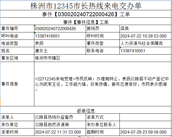 7月22日,炎陵县自然资源局不动产登记中心收到12345政务服务便民热线转来的一份唐女士表示感谢的表扬工单,内容是:办理商转公,表扬炎陵县自然资源局不动产登记中心刘武军主任,工作能力强,非常热情,服务态度很好,本人表示感谢。