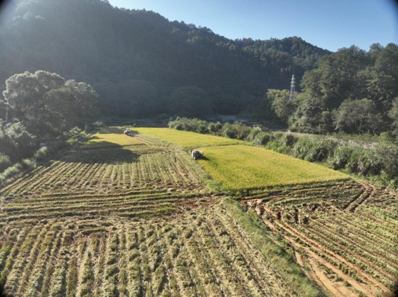 风和日丽的晚秋,在湘赣边罗霄山脉脚下的炎陵县城,我们驱车沿霞阳镇政府旁的小路一直往南,七拐八拐到了石玉村龙潭组,在四周被山包围的山旮旯里一位衣着简式夹克的农民,戴个泛白的鸭舌帽,扛个小锄头,微弯曲的脊背,黑棕色的脸庞,正在夕阳余辉洒照的田间指挥三台收割机抢收晚稻,只见翻滚的稻杆渣不断地从收割机吐出来,几个回合下来,装运稻谷的农用车拖斗已经隆成小山式的稻谷包。