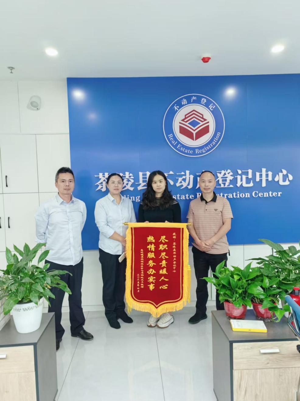 近日,茶陵县自然资源局的不动产登记中心收到高陇镇原供销社和生资仓库购地户代表送来的锦旗,感谢其为高陇镇集镇居民解决近20年的办证问题,让他们如愿都拿到的心心念念的红本本。