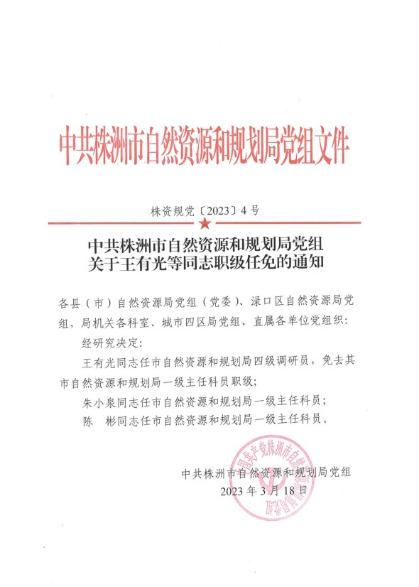 关于王有光等同志职级任免的通知 (株资规党[2023]4号)