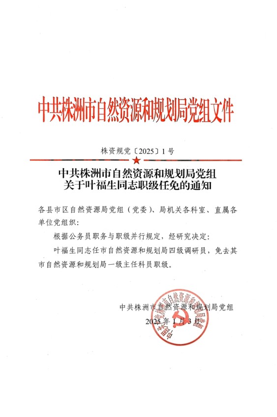 株资规党[2025]1号(关于叶福生同志职级任免的通知)