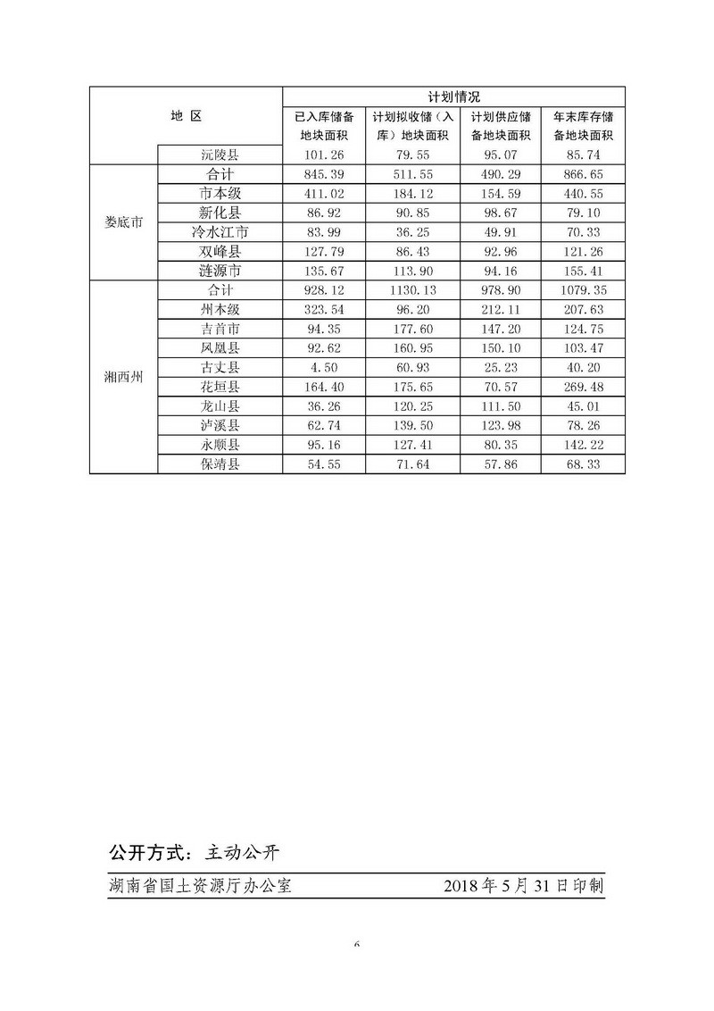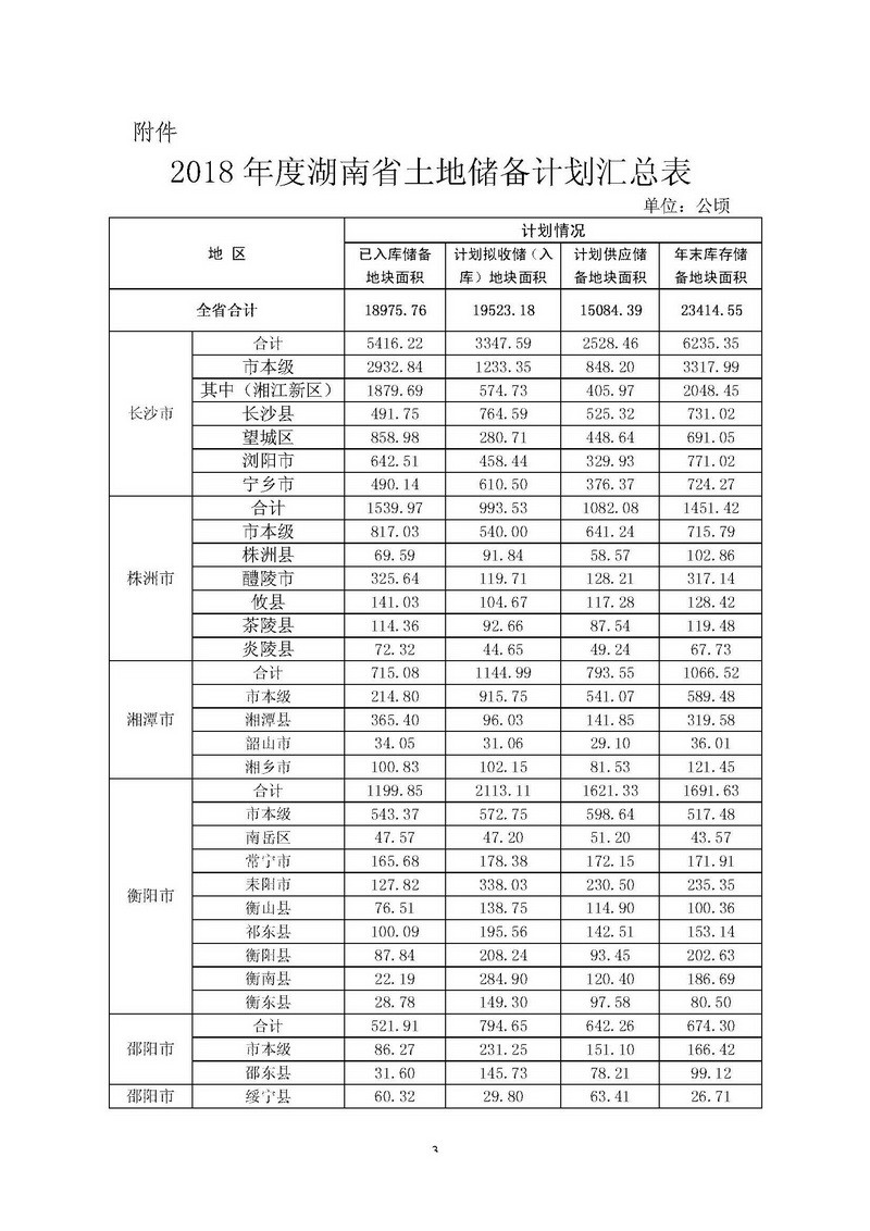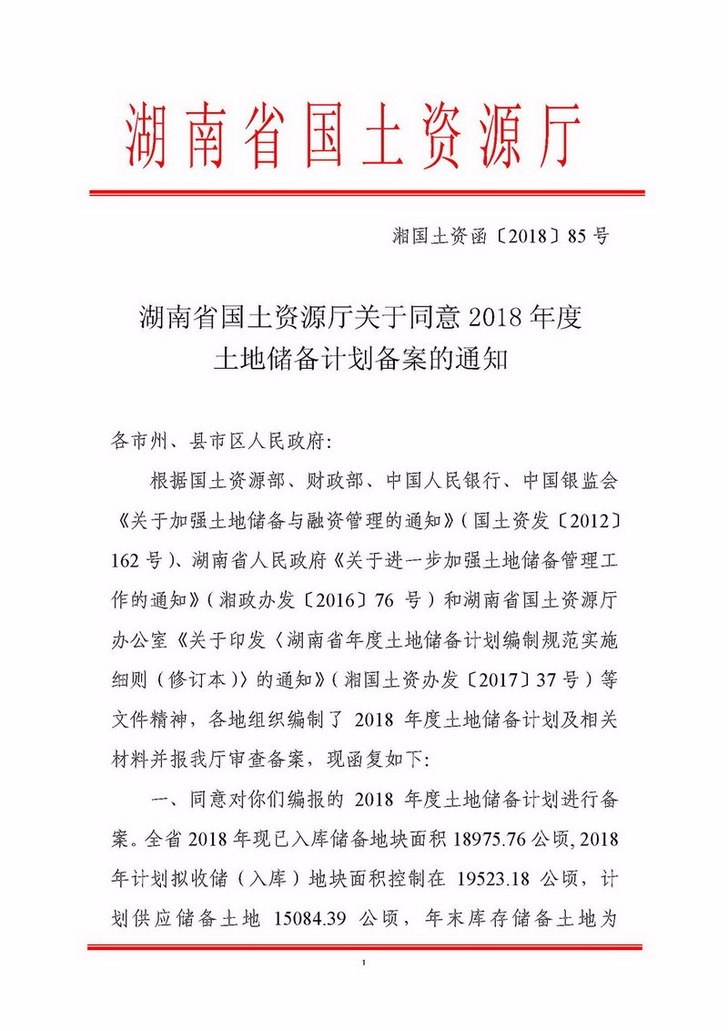湖南省国土资源厅关于同意2018年度土地储备计划备案的通知