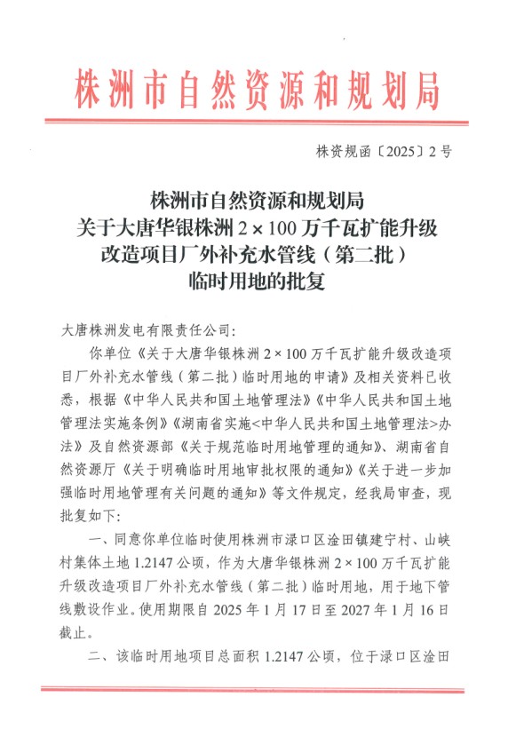 大唐华银株洲2x100万千瓦扩能升级改造项目厂外补充水管线(第二批)临时用地批复.doc