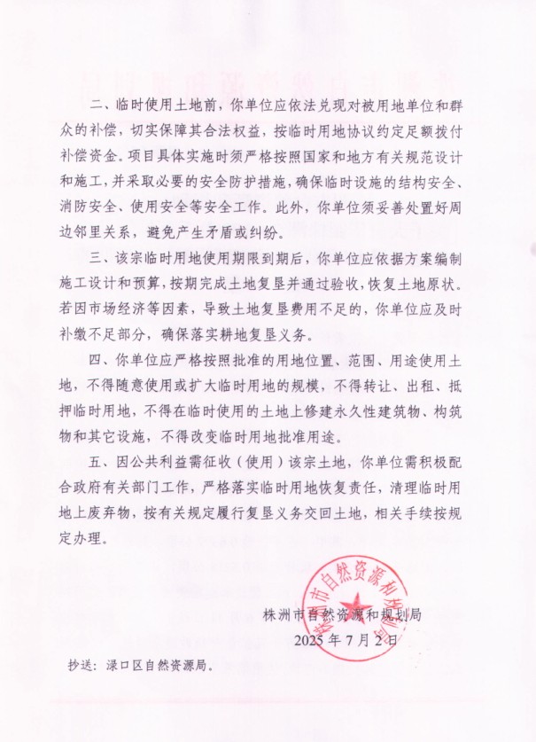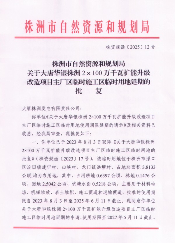 关于大唐华银株洲2×100万千瓦扩能升级改造项目主厂区临时施工区临时用地延期的批复