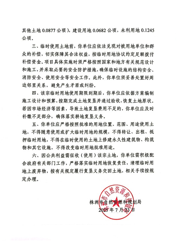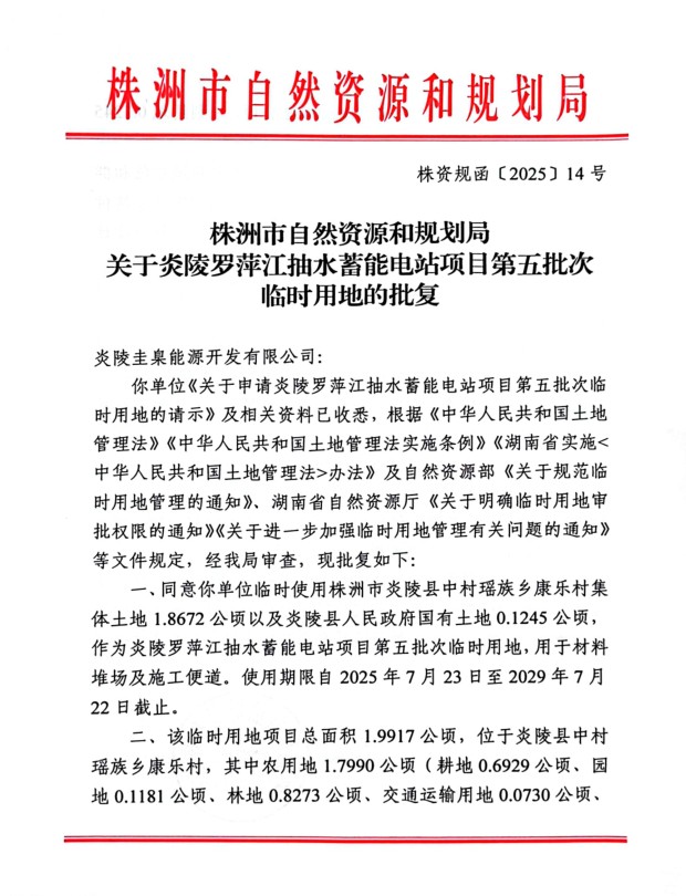 关于炎陵罗萍江抽水蓄能电站项目第五批次临时用地的批复