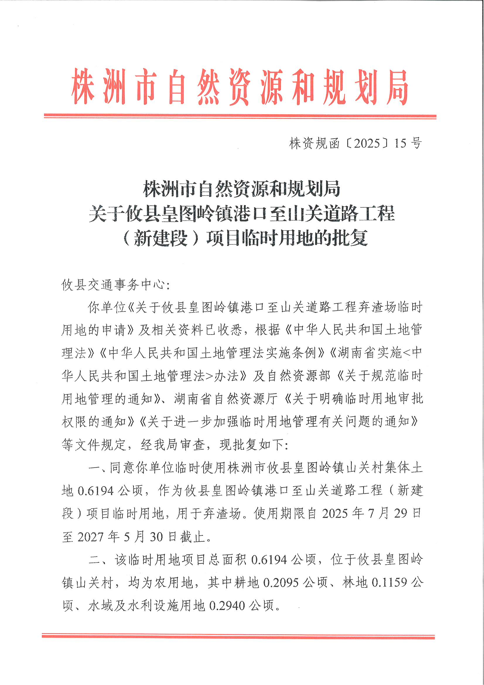关于攸县皇图岭镇港口至山关道路工程(新建段)项目临时用地的批复