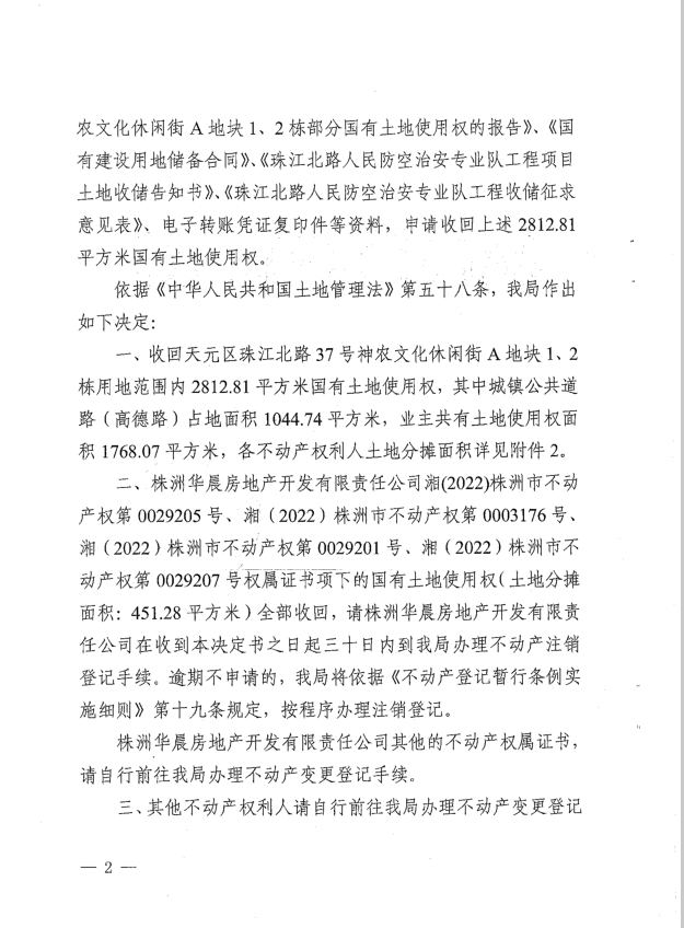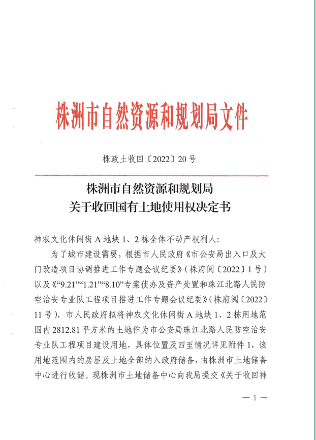 株洲市自然资源和规划局关于收回国有土地使用权决定书