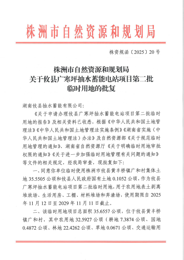 攸县广寒坪抽水蓄能电站项目第二批临时用地批复
