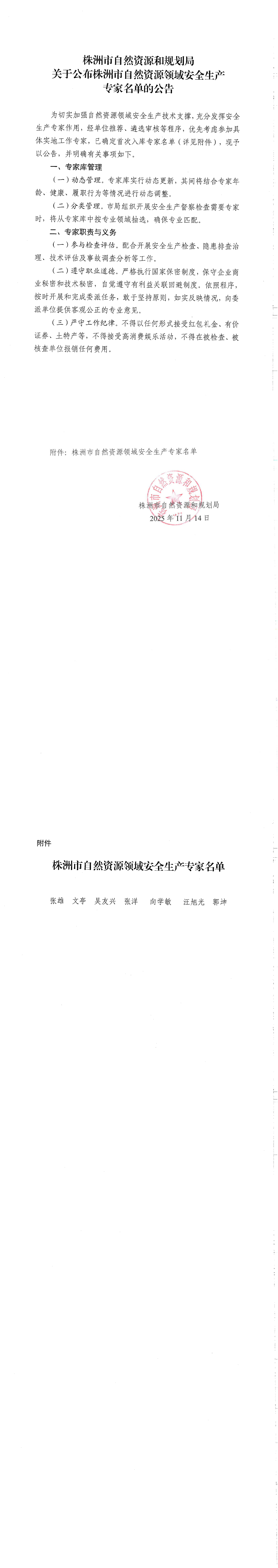 株洲市自然资源和规划局关于公布株洲市自然资源领域安全生产专家名单的公告