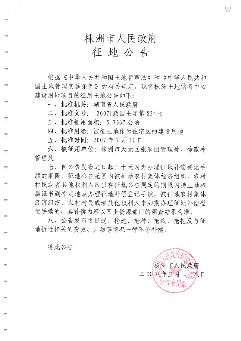 征地公告(天元区张家园管理处、徐家冲管理处储备用地5.7367公顷)