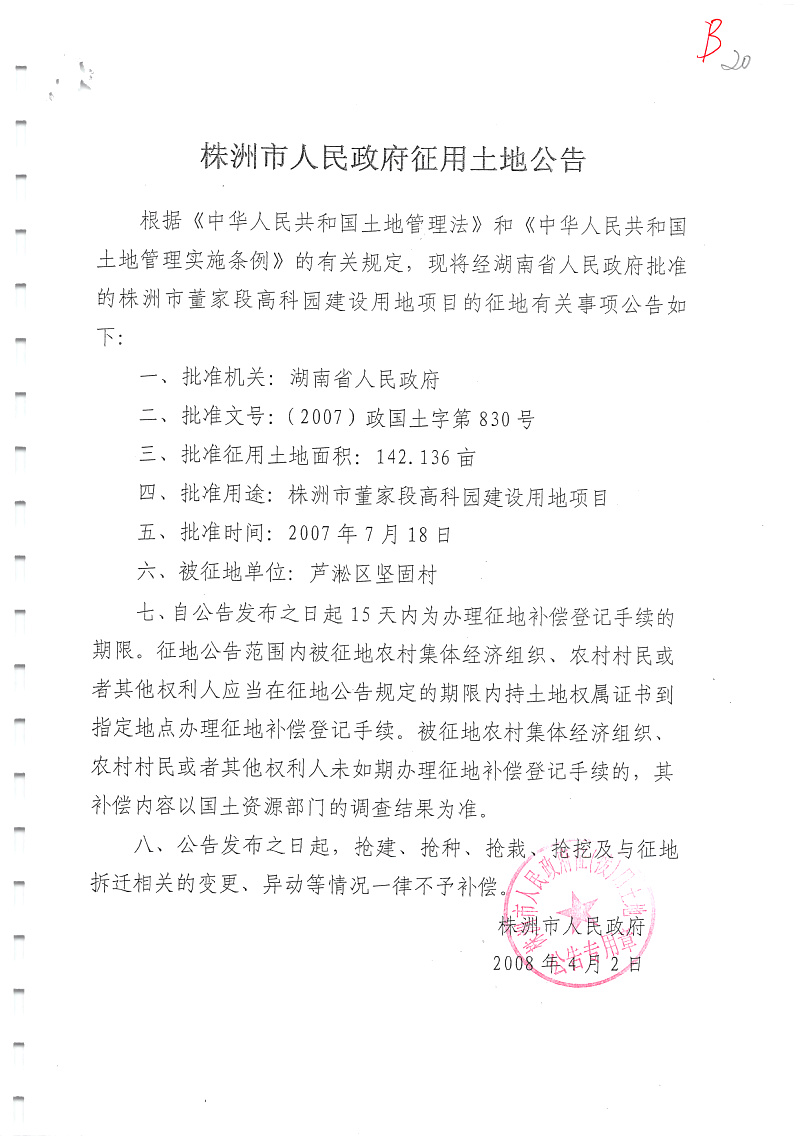 征地公告(董家段高科园芦淞区坚固村142.136亩)