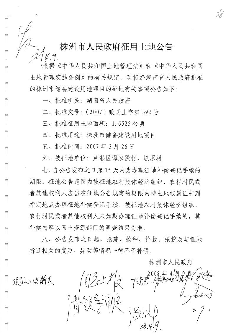 征地公告(芦淞区谭家段村、燎原村储备用地1.6525公顷)