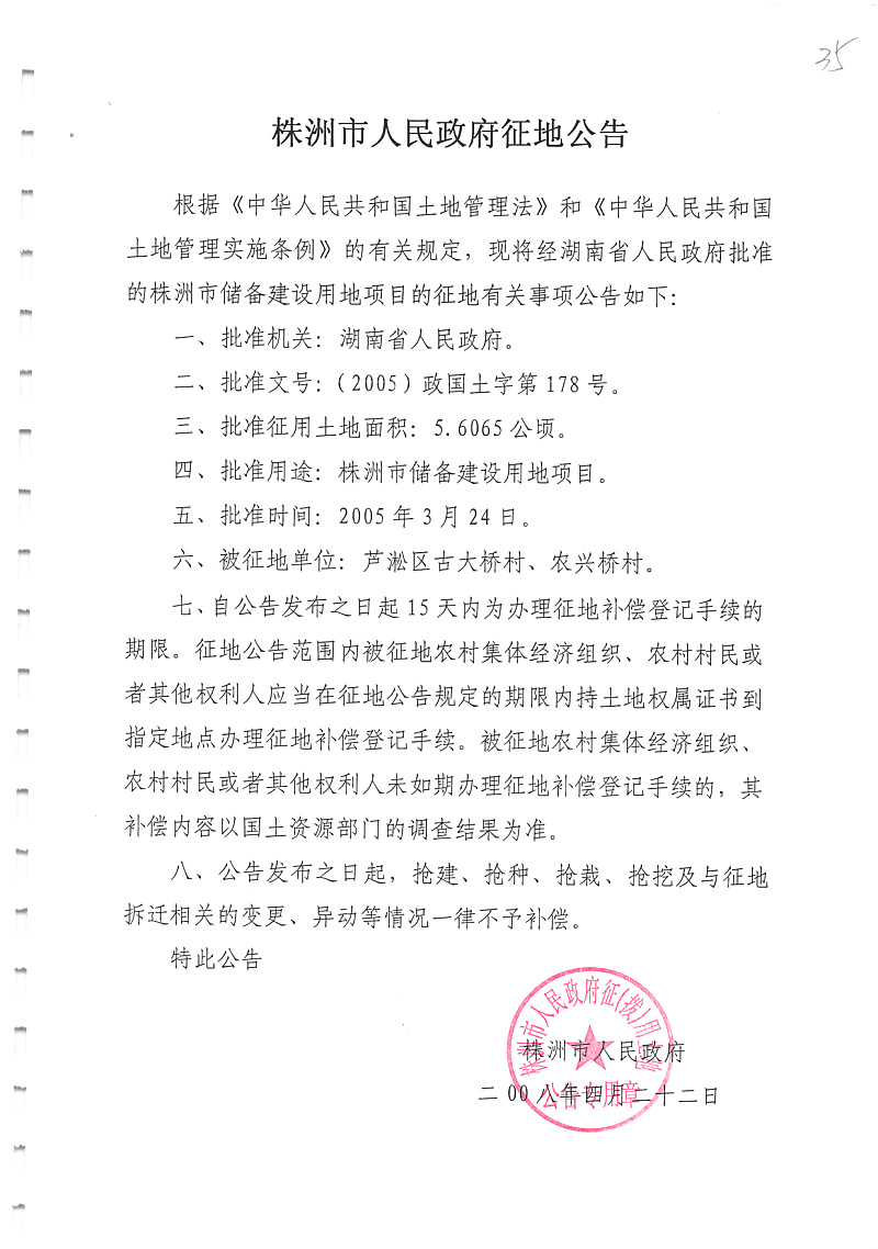 征地公告(芦淞区古大桥村、农兴桥村储备地5.6065公顷)