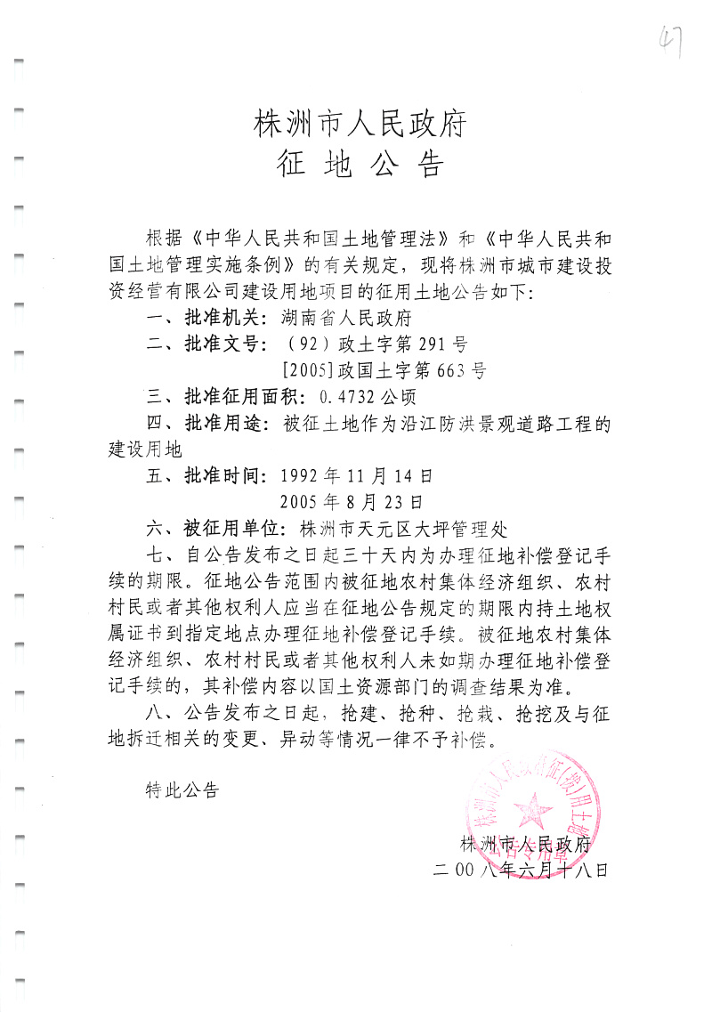 征地公告(沿江防洪景观道路工程)