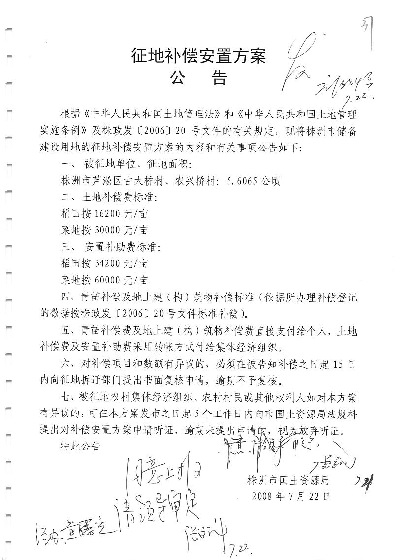安置公告(芦淞区古大桥、农兴桥村储备用地5.6065公顷)
