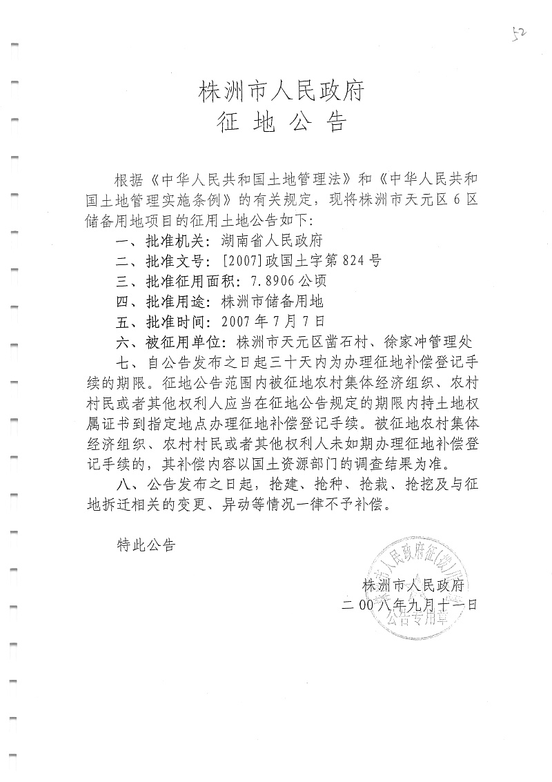 征地公告(天元区6区储备用地7.8906公顷)