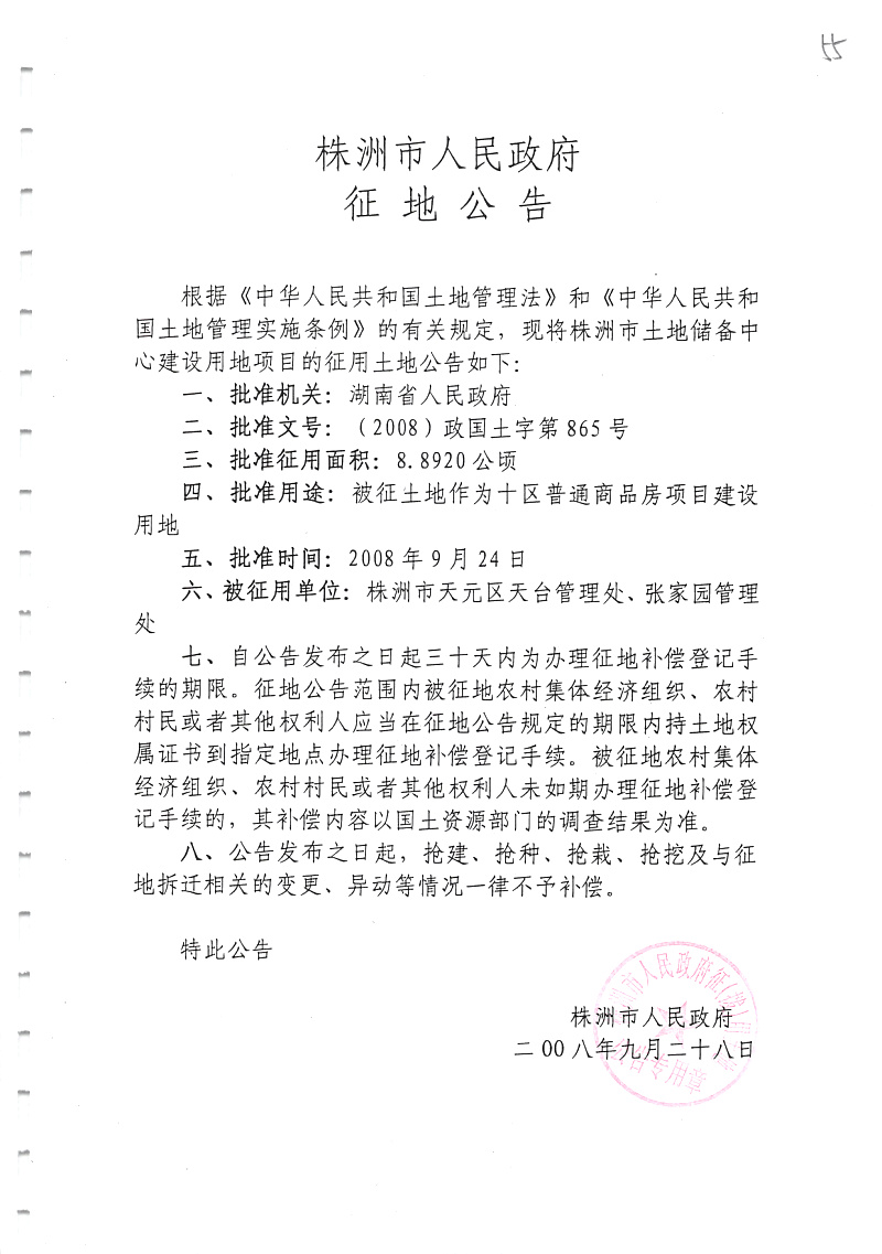 征地公告(天元区十区普通商品房8.8920公顷)
