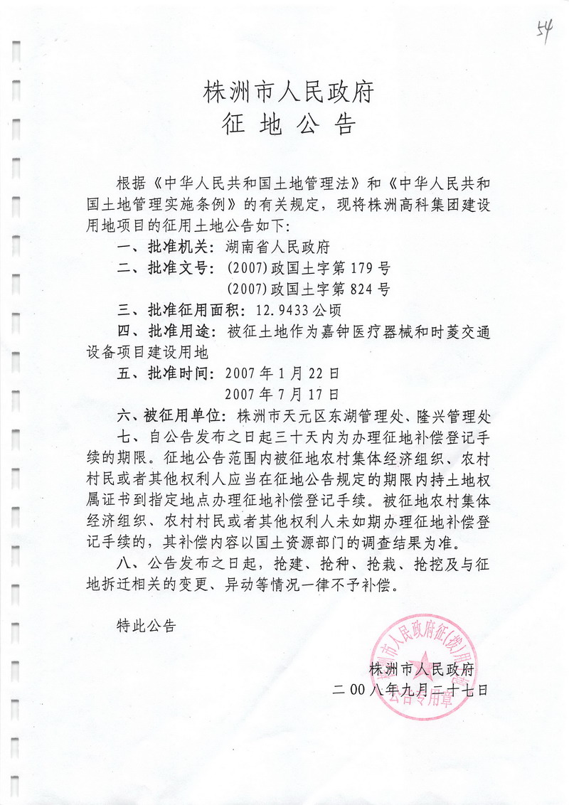 征地公告--株洲高科嘉钟医疗器械和时菱交通设备项目